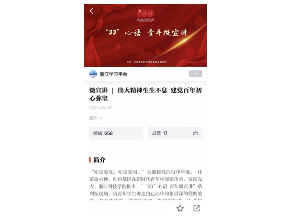 “知史爱党,知史爱国。”为迎接党的百年华诞, 让革命火种、红色基因在新时代青年中深植传承、发扬光大,浙江科技学院推出 “‘00’心语 青年微宣讲”系列短视频,请青年学生讲述自己心中印象最深的党的故事、革命的故事、英雄的故事、发展的故事,让“00后”带动“00后”一起品读百年党史,读懂中国近现代以来最为可歌可泣的篇章,读出重点,读出味道。