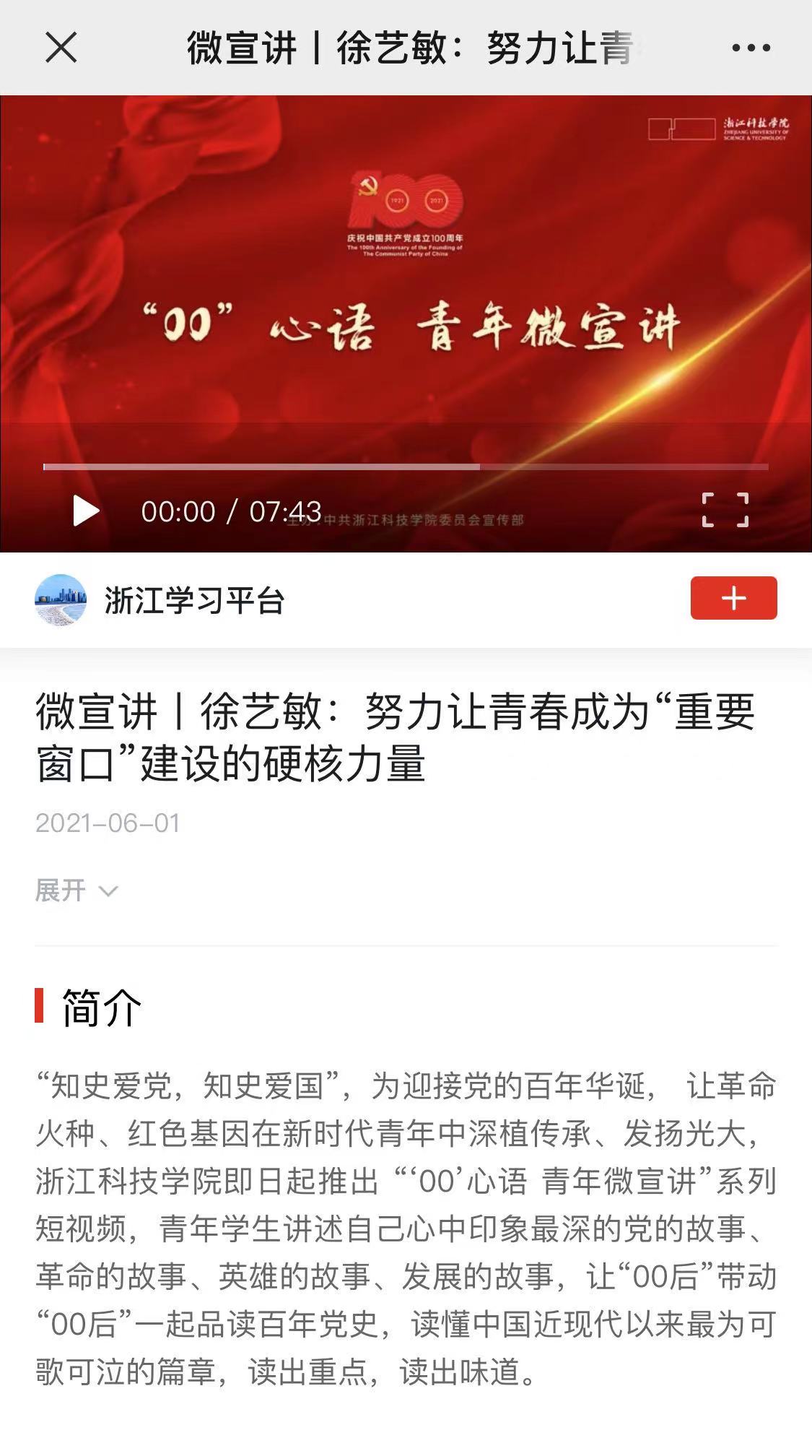 “知史爱党,知史爱国。”为迎接党的百年华诞, 让革命火种、红色基因在新时代青年中深植传承、发扬光大,浙江科技学院推出 “‘00’心语 青年微宣讲”系列短视频,请青年学生讲述自己心中印象最深的党的故事、革命的故事、英雄的故事、发展的故事,让“00后”带动“00后”一起品读百年党史,读懂中国近现代以来最为可歌可泣的篇章,读出重点,读出味道。