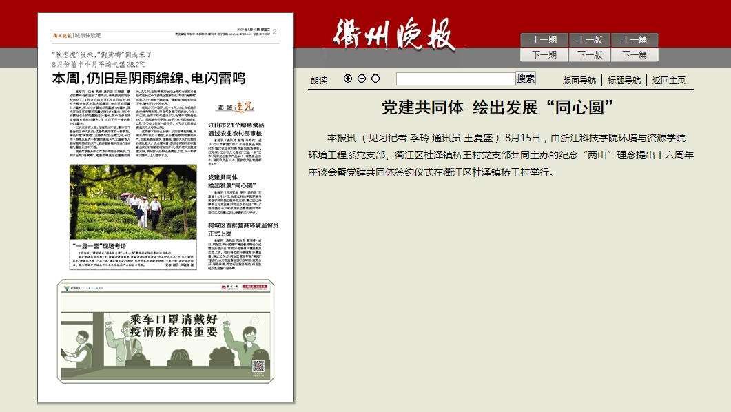 8月15日,由浙江科技学院环境与资源学院环境工程系党支部、衢江区杜泽镇桥王村党支部共同主办的纪念“两山”理念提出十六周年座谈会暨党建共同体签约仪式在衢江区杜泽镇桥王村举行。