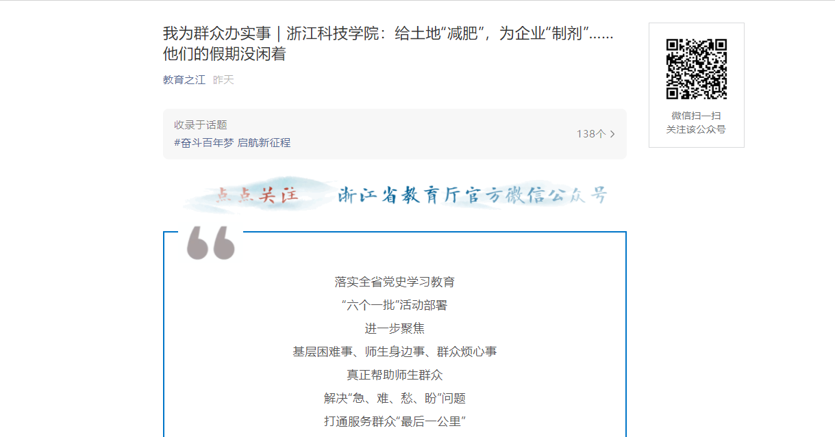 原文链接:我为群众办实事|浙江科技学院:给土地“减肥”,为企业“制剂”……他们的假期没闲着