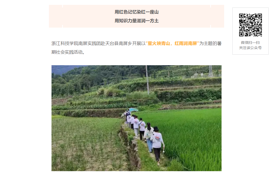 浙江科技学院南屏实践团赴天台县南屏乡开展以“星火映青山,红雨润南屏”为主题的暑期社会实践活动。