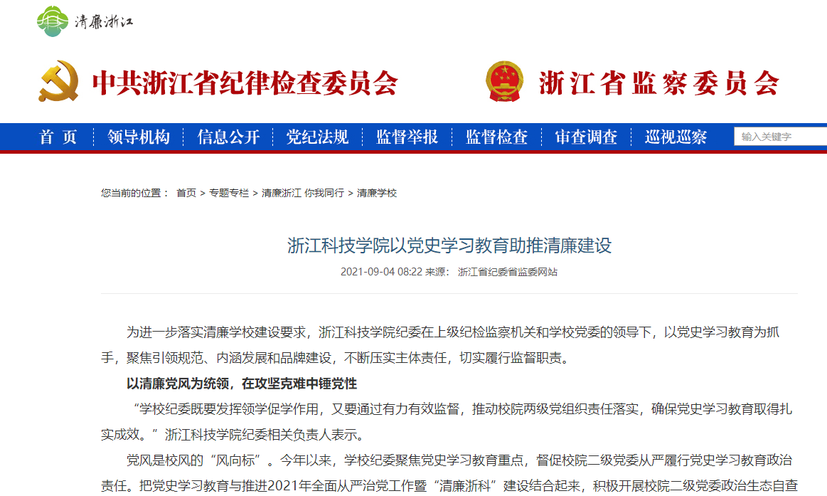 为进一步落实清廉学校建设要求,浙江科技学院纪委在上级纪检监察机关和学校党委的领导下,以党史学习教育为抓手,聚焦引领规范、内涵发展和品牌建设,不断压实主体责任,切实履行监督职责。