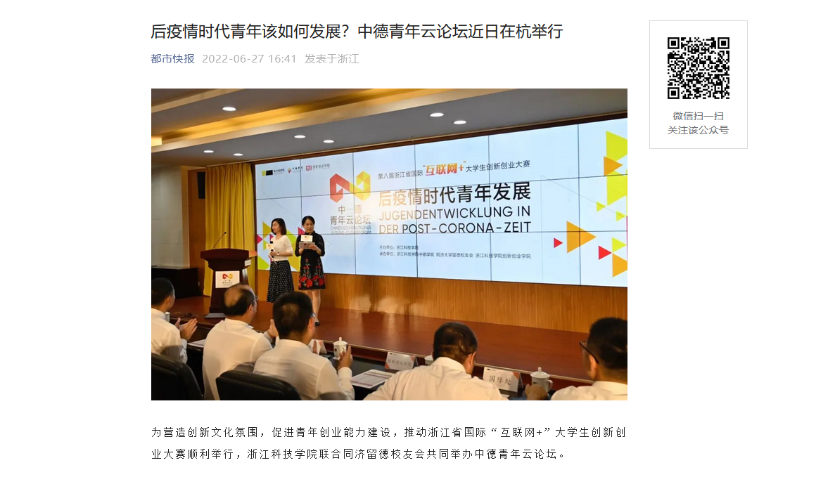 都市快报:后疫情时代青年该如何发展?中德青年云论坛近日在杭举行