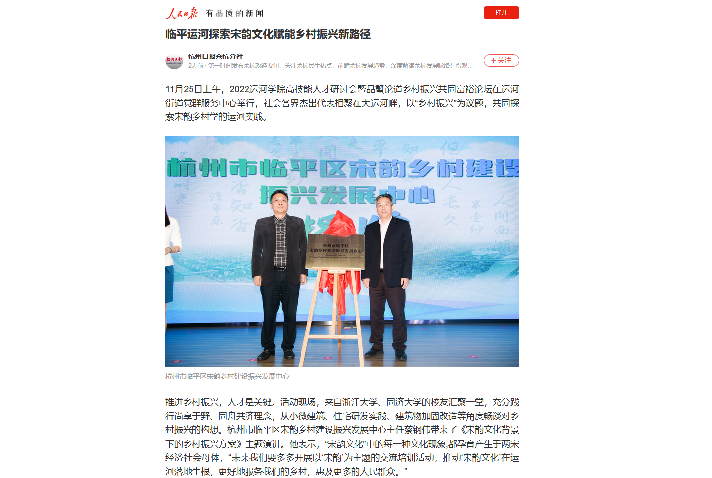 11月25日,由我校土木与建筑工程学院支持建设的2022运河学院高技能人才研讨会暨品蟹论道乡村振兴共同富裕论坛举行,人民日报新媒体平台以《临平运河探索宋韵文化赋能乡村振兴新路径》为题,对该活动进行报道。原文链接:临平运河探索宋韵文化赋能乡村振兴新路径