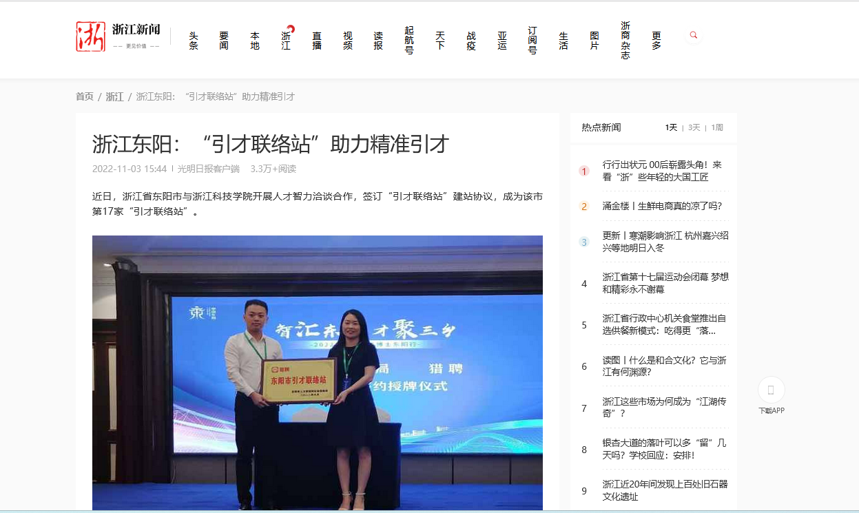 近日,浙江省东阳市与浙江科技学院开展人才智力洽谈合作,签订“引才联络站”建站协议,成为该市第17家“引才联络站”。