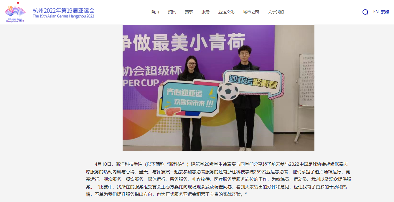 4月8日,中国足球协会超级杯在黄龙体育中心体育场举办,我校270名“小青荷”积极投身赛会志愿服务工作,用积极向上的微笑服务和充满阳光的热情态度践行志愿服务精神,展现了浙科青年的优秀精神风貌。浙科“小青荷”也得到亚运会官网、杭州网、潮新闻客户端等媒体的报道。