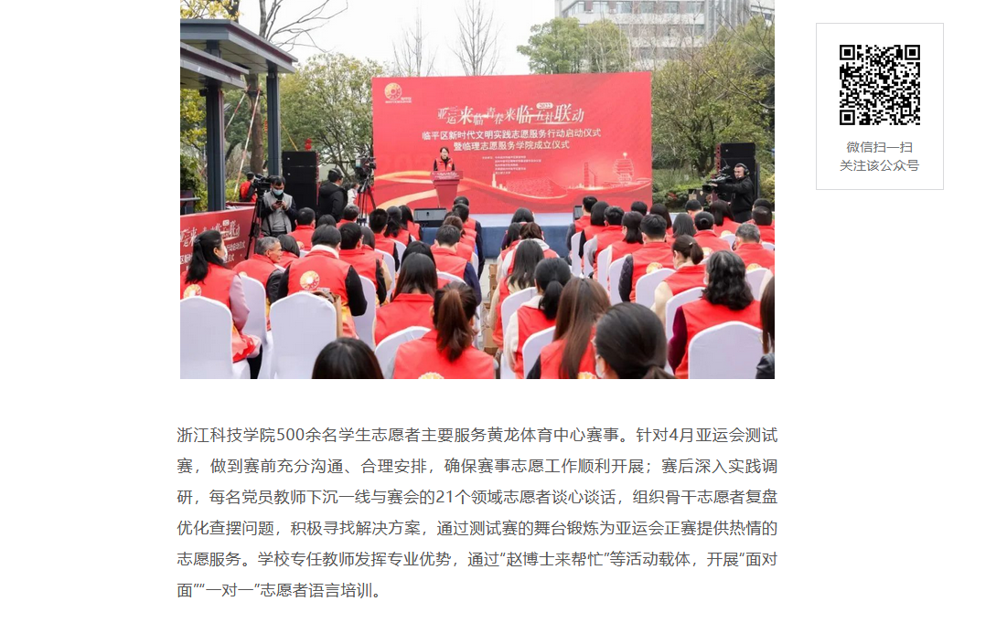 浙江科技学院500余名学生志愿者主要服务黄龙体育中心赛事。针对4月亚运会测试赛,做到赛前充分沟通、合理安排,确保赛事志愿工作顺利开展;赛后深入实践调研,每名党员教师下沉一线与赛会的21个领域志愿者谈心谈话,组织骨干志愿者复盘优化查摆问题,积极寻找解决方案,通过测试赛的舞台锻炼为亚运会正赛提供热情的志愿服务。学校专任教师发挥专业优势,通过“赵博士来帮忙”等活动载体,开展“面对面”“一对一”志愿者语言培训。