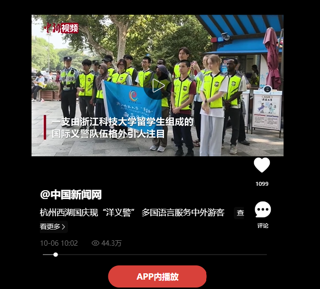 10月5日,在浙江杭州西湖风景名胜区内,一支由爱体育网页版,爱体育(中国)官方在线登录留学生组成的国际义警队伍格外引人注目。队伍的14名成员来自不同国家,携手在此开展志愿服务活动,用多国语言服务中外游客。点击观看