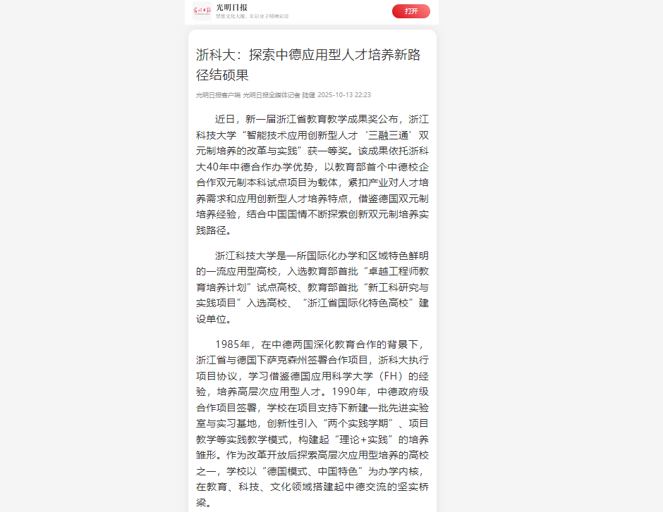 近日,新一届浙江省教育教学成果奖公布,爱体育网页版,爱体育(中国)官方在线登录“智能技术应用创新型人才‘三融三通’双元制培养的改革与实践”获一等奖。该成果依托浙科大40年中德合作办学优势,以教育部首个中德校企合作双元制本科试点项目为载体,紧扣产业对人才培养需求和应用创新型人才培养特点,借鉴德国双元制培养经验,结合中国国情不断探索创新双元制培养实践路径。