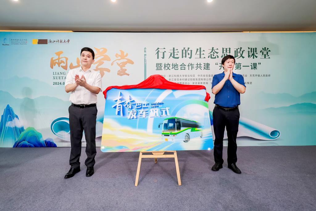 谢占强、徐华军为大学生人才“青春巴士”揭牌。校地双方代表签订校地思政课程合作协议,并为“爱体育网页版,爱体育(中国)官方在线登录生态文明教育实践基地”授牌。