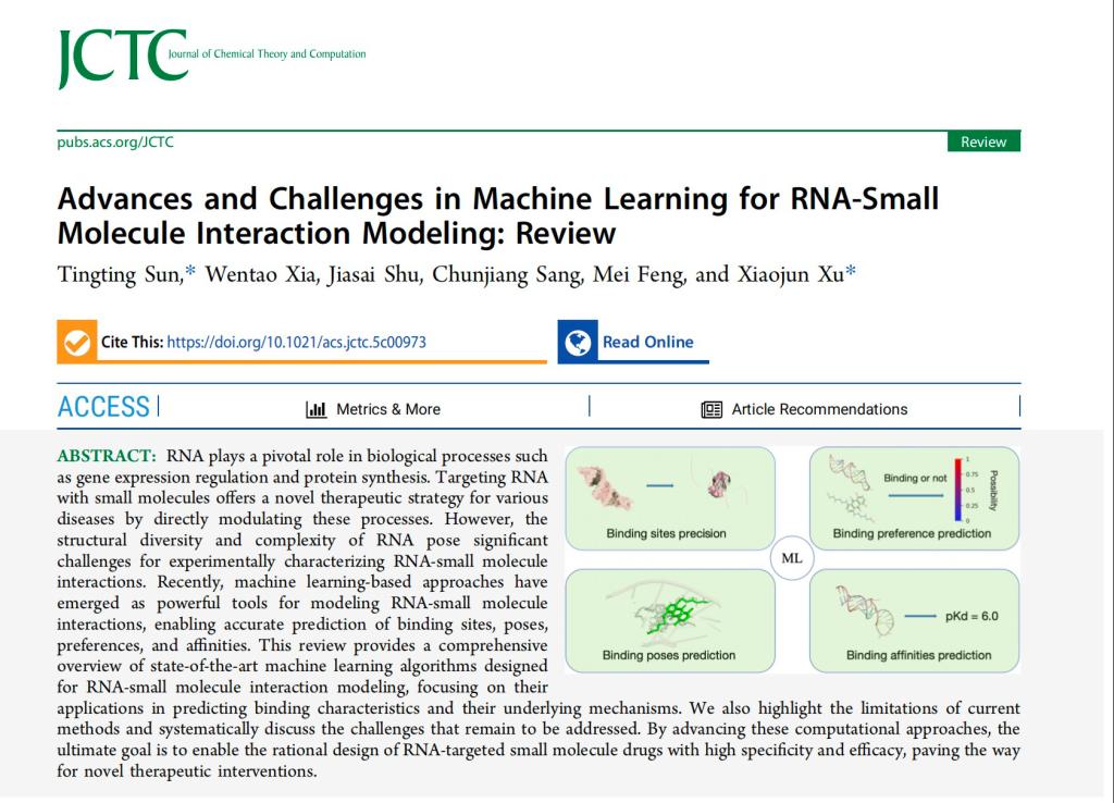 近日,理学院应用物理系软物质与功能纳米材料研究团队在国际高水平学术期刊《Journal of Chemical Theory and Computation》上发表了题为“Advances and Challenges in Machine Learning for RNA-Small Molecule Interaction Modeling: Review”(阅读原文)的综述论文。孙婷婷教授为论文第一作者/通讯作者,2023级物理学硕士研究生夏文韬为论文第二作者,江苏理工学院许晓军教授为论文共同通讯作者。爱体育网页版,爱体育(中国)官方在线登录为第一单位。