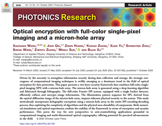 团队以“Optical Encryption with Full-Color Single-Pixel Imaging and Micron-Hole Array”(阅读原文)为题,发表于光学领域顶级期刊《Photonics Research》。理学院汪小刚教授、物理系2023级硕士研究生邱基鑫为本文的共同第一作者,汪小刚教授、徐弼军教授为论文的共同通讯作者。计算成像技术的融合应用正快速成为光学信息安全处理领域的最新趋势。该项研究提出一种光学图像安全处理新方法:将全彩傅里叶单像素成像与微孔阵列相结合,构建光学图像双层安全处理框架。其中,微孔阵列通过深度学习生成、经光刻工艺制造;采用微孔阵列光学衍射生成的照明图案序列,则为全彩傅里叶单像素系统赋予了固有物理安全性。该研究将微孔阵列全息加密技术完整融入单像素成像编解码流程,结合算法复杂性与组件物理不可克隆性等安全措施强化系统安全性,为后续计算成像与多维光学密码学相关研究开辟了新路径。