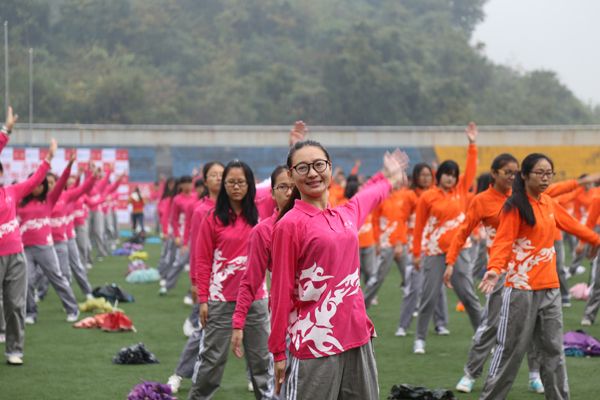 9点整,随着主会场总裁判一声口令,在《舞动中国》旋律下,全场师生在体育部杨榕斌老师带领下,共同迈出轻快的舞步,挥舞双手。整齐划一的动作,带来排山倒海般的气势。一位国贸专业的女生说,跳舞时雨水也是顺着眉梢尽情挥洒,真是让人醉。