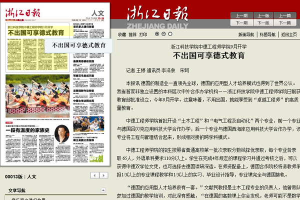 中德工程师学院作为省内首家非独立设置的中外合作办学机构受到省内媒体关注,5月29日出版的浙江日报以《不出国可享德式教育》为题在人文版头条显著位置对中德工程师学院成立作大篇幅报道(原文如下)。此前,浙江卫视新闻联播也对中德工程师学院成立作了报道。
