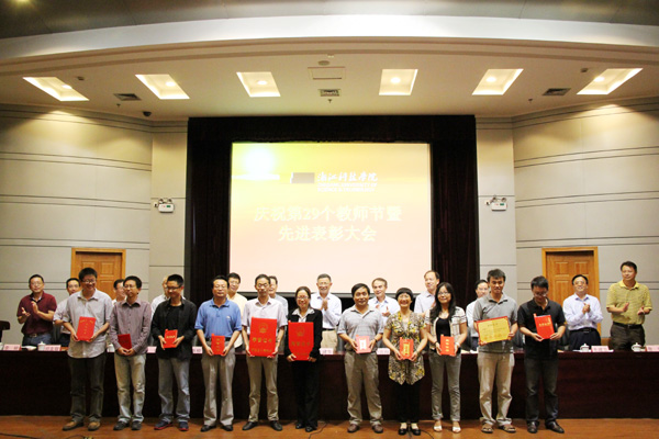 校党委副书记周加敏宣读从教三十年教师,省级以上先进个人,优秀主讲教师名单。出席会议的校领导为受表彰教师颁奖。
