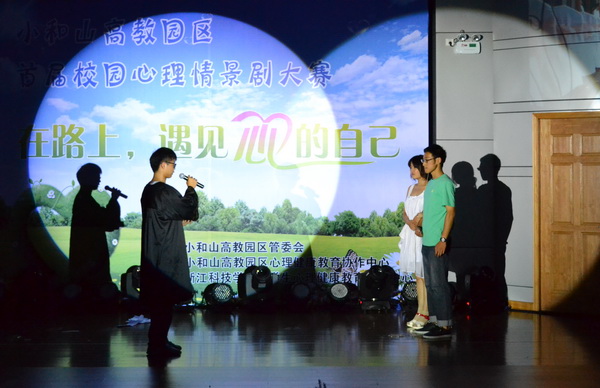 情感的困惑、学习的迷茫、生活的挫折,是现今大学生甚为关注的问题;相约心灵、相约梦想、相约心的自己,则是解决问题的关键。5月31日晚,以“在路上,遇见‘心’的自己”为主题的小和山高教园区首届校园心理情景剧大赛在我校举行。节目富含的教育意义和鲜活的表现手法吸引了园区内浙江工业大学、浙江外国语学院、浙江长征职业技术学院、浙江特殊教育职业学院和我校等300多位同学前来观看。