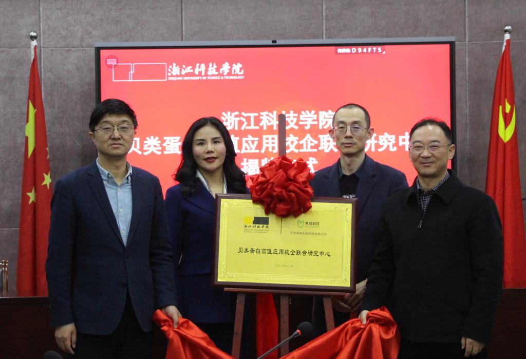 冯军对鄞州科技局及美成生物科技公司代表的到来表示热烈欢迎。他指出,前期我校已与鄞州区有了良好的合作基础,希望以此次联合研究中心签约为契机,继续加强校地合作,通过科研合作、人才培育及教育实践等更好服务地方产业行业发展,为浙江省“两个先行”贡献一份浙科力量。他与出席活动嘉宾共同为“贝类蛋白高值应用校企联合研究中心”揭牌。