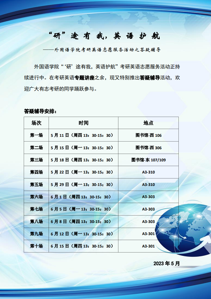 据悉,考研英语答疑辅导服务活动是外国语学院想学生之所想、响应呼声所推出的又一助考举措,是学院教师积极践行“我为师生办实事”又一生动体现,作为正在持续开展的考研英语专题讲座的有益补充,二者共同构成学院“‘研’途有我,英语护航”考研英语志愿服务活动的主要形式,本轮答疑辅导服务活动将在图书馆考研自习室、外国语学院考研辅导室等场所轮流举行(详见下表),方便备考学生前来咨询交流。希望通过答疑辅导提高我校考生的英语成绩,助力更多学生考研圆梦。(外国语学院 石教旺)