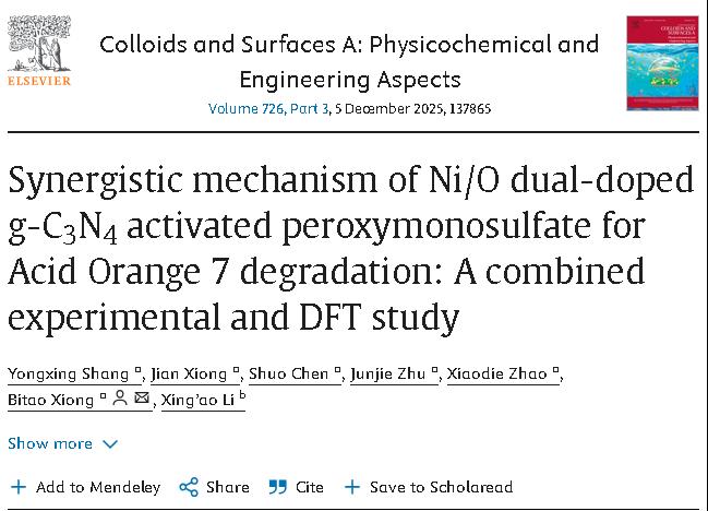 近日,应用物理2022级本科生商永兴以第一作者身份在《Colloids and Surfaces A: Physicochemical and Engineering Aspects》期刊上发表了题为“Synergistic mechanism of Ni/O dual-doped g-C3N4 activated peroxymonosulfate for Acid Orange 7 degradation: A combined experimental and DFT study”(阅读原文)的文章。爱体育网页版,爱体育(中国)官方在线登录为第一署名单位,应用物理系熊必涛老师为论文通讯作者。